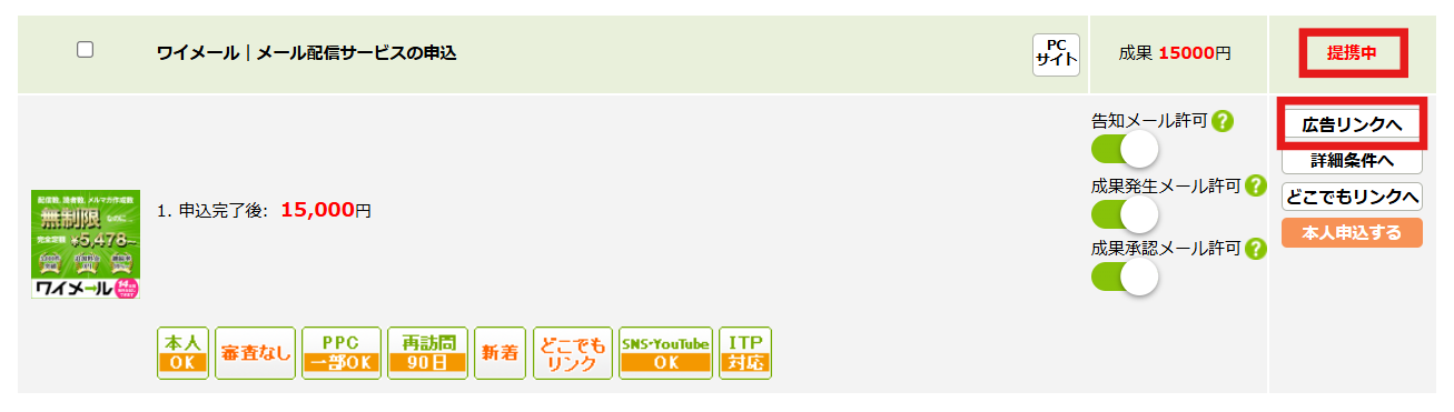 当プロモーション「ワイメール|メール配信サービスの申込 」が検索結果に表示されますので、「提携申請する」ボタンをクリックして提携申請します。