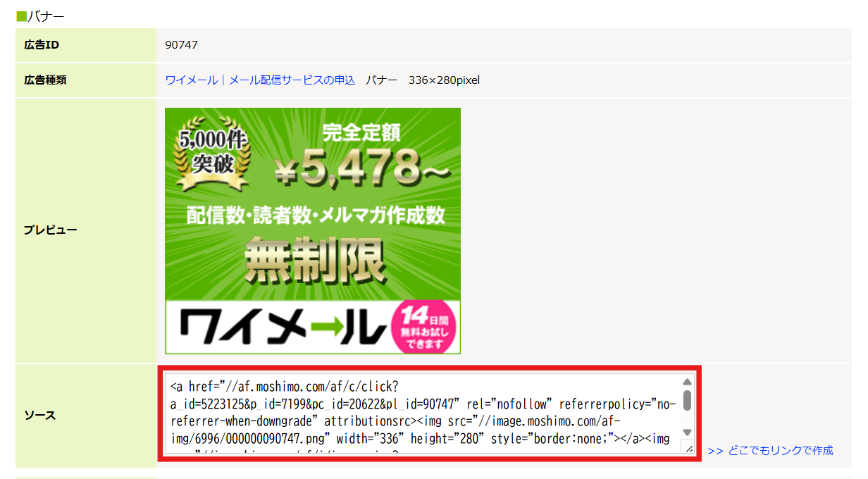 提携が承認されたら、プロモーションの「広告サンプルへ」ボタンから、用途に合わせてお好きな広告原稿を取得します。